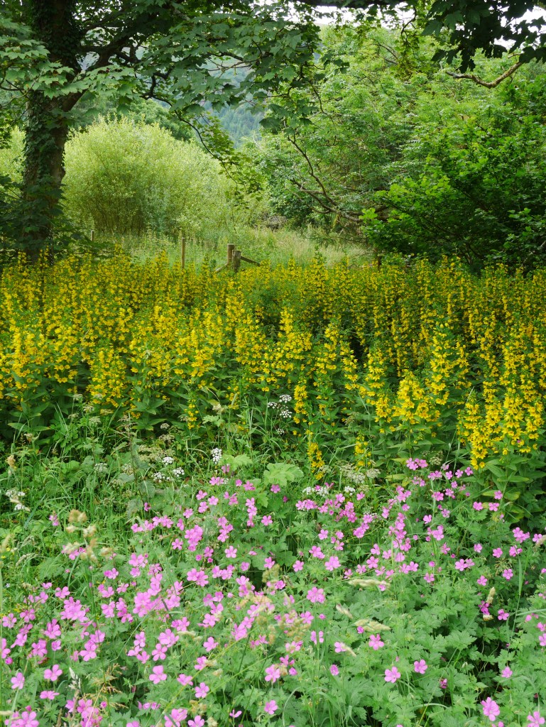 Thankfully it turned into a gorgeous sunlit evening as we walked through the old slate quarries. Here, says our book, slate miners lived during the week and sent messages to their families via carrier pigeon. The path follows the route of the old tramway. We were driven on by the thought that our hotel kitchen might well close if we got there too late, so it was a route march into the Borrowdale valley with the sun warming our backs.