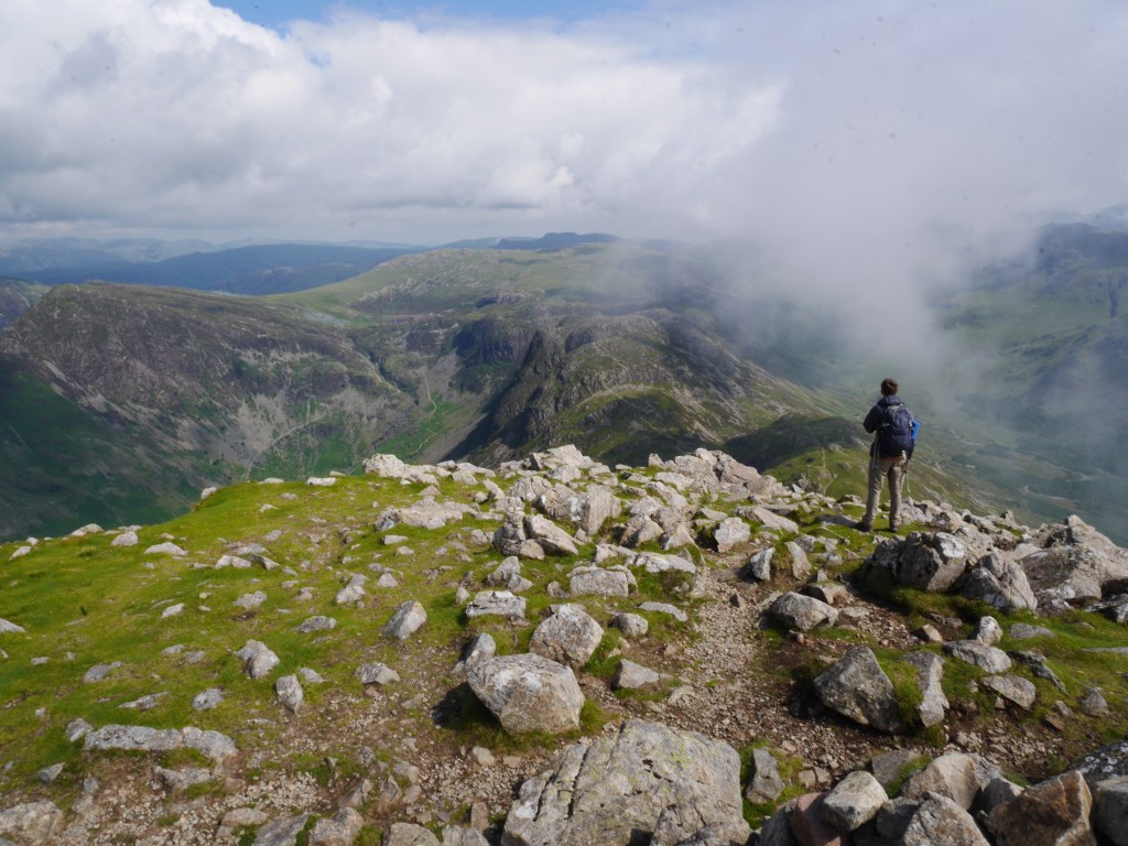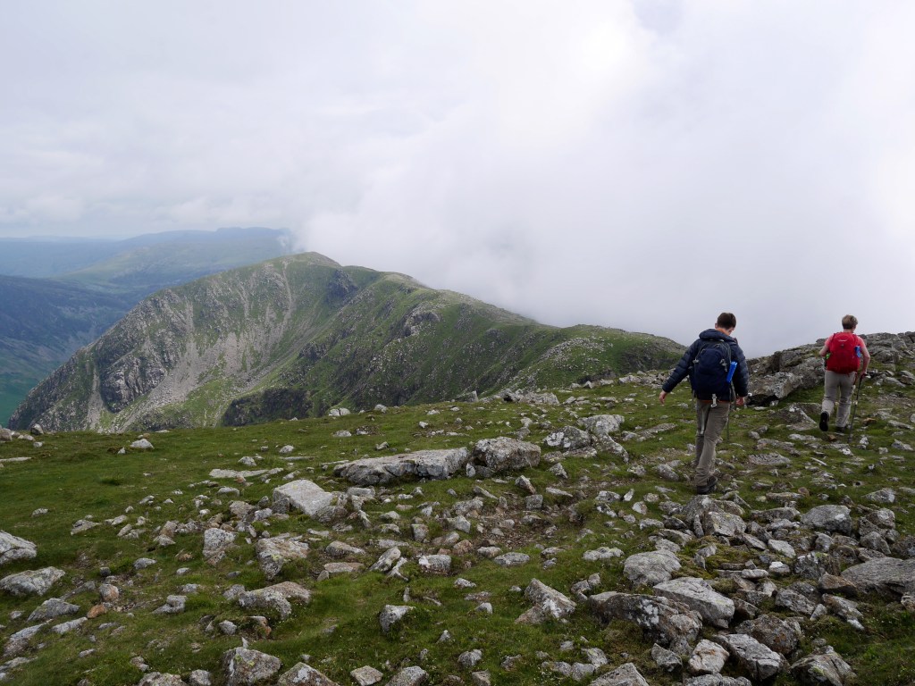 Next along the ridge was High Stile, at 807m, the highest point in the Coast to Coast. Cloud was now piling up on one side of the narrow ridge, with wisps spilling over and dissolving in the sunshine, like dry ice. As we scrambled over jagged rocks to the summit, a man with an eager spaniel was coming down. “He’s dragged us up and now he’s dragging us down”. He said. Perhaps we could borrow him? “Yours for a fiver” he laughed.