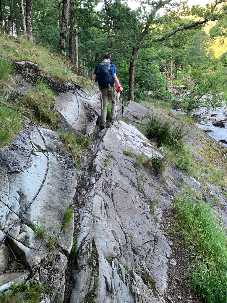 It is an idyllic place. A busy river gushes through rocks and ferns and old woodland rises either side of it. Clumps of stone houses some whitewashed, some dark slate, soaked up the late sunshine. We marched on through the woods and by a river with a chain set into a rocky ledge to grab hold of.