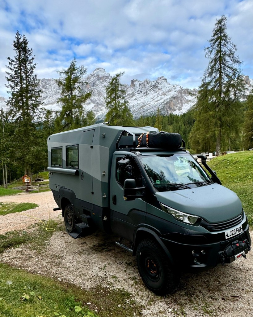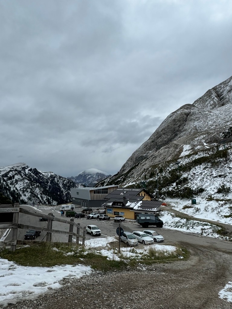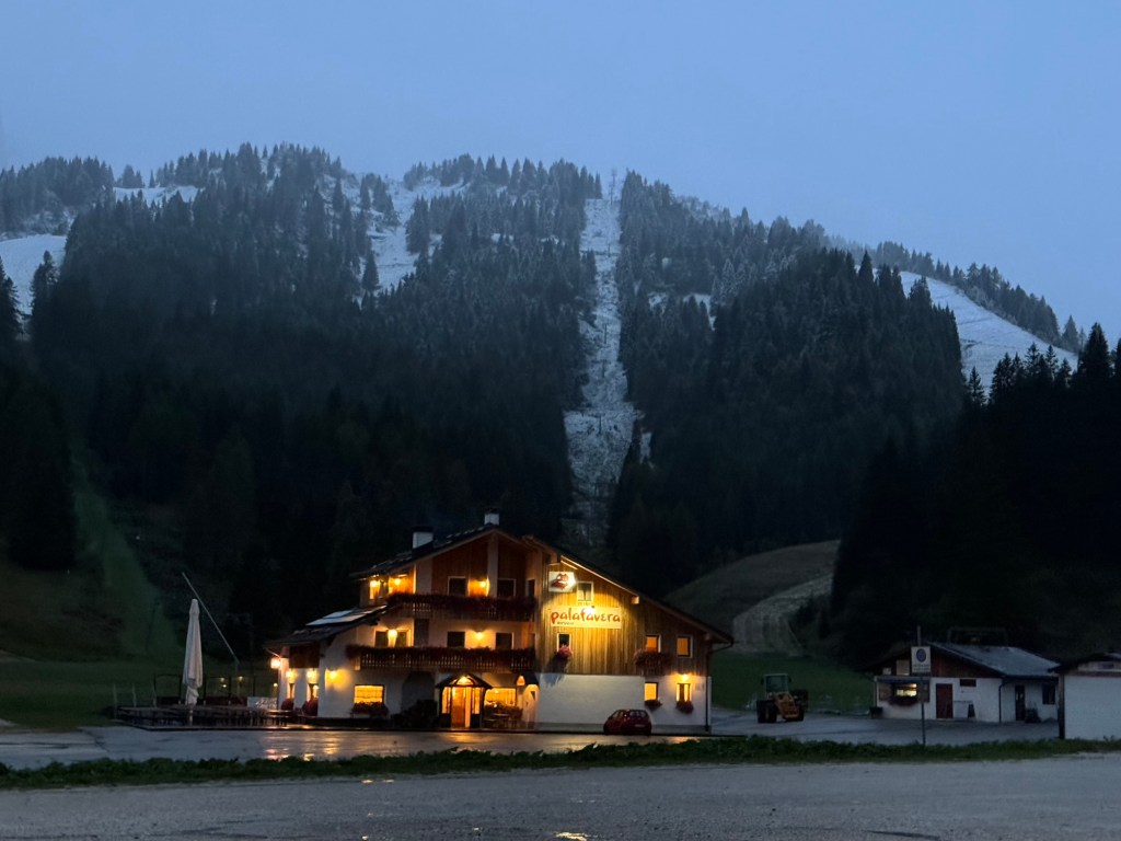 We’ve been parked in an almost deserted campsite for the past few days so P can catch up with some work stuff via Starlink (or “Starnielink” as I insist on calling it). The rain has been hammering down and we read that parts of Austria north of us have been badly flooded. The season ends here in a couple of weeks and we are surrounded by empty caravans which have been made more or less permanent with wooden porches and additional roofing. One or two owners are bringing in barbecues and awnings and getting ready for winter. The first taste of it came in the evening as we were eating in the Rifugio across the road which was already braced for cold weather.