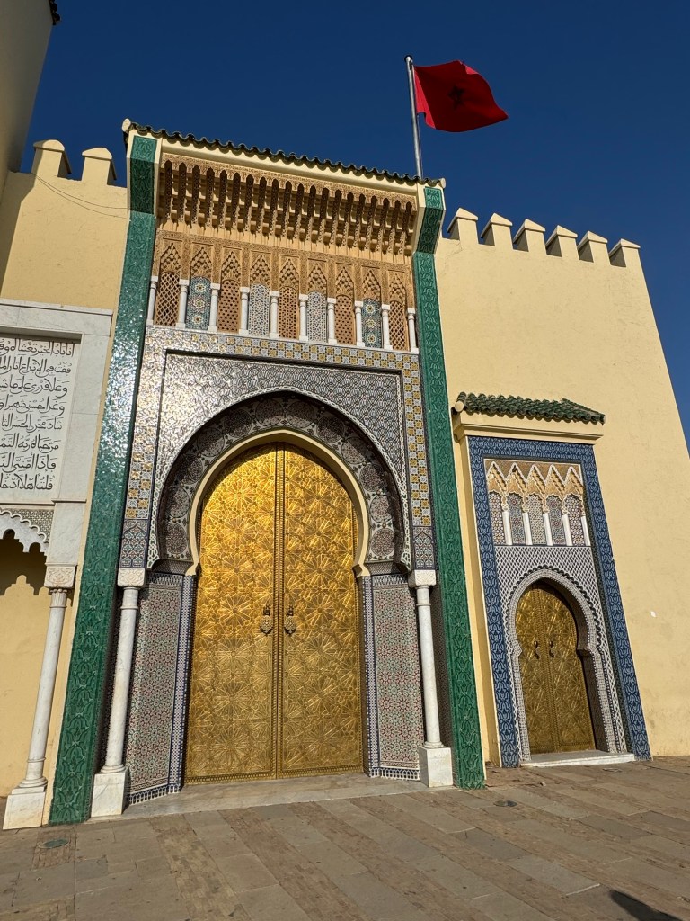 Even though we were in Fez, it was a 10km drive to the old city. We decided to nibble the edge of it for the afternoon and walked to the main road where we hailed one of the battered red taxis. We’d braced for a battle over the price but the driver pointed to the meter (a little part of the Morocco legend falls away) and off we went, to be dropped off at the Royal Palace. There we discovered that the big doors open only for the King, along, in fact with the rest of it.