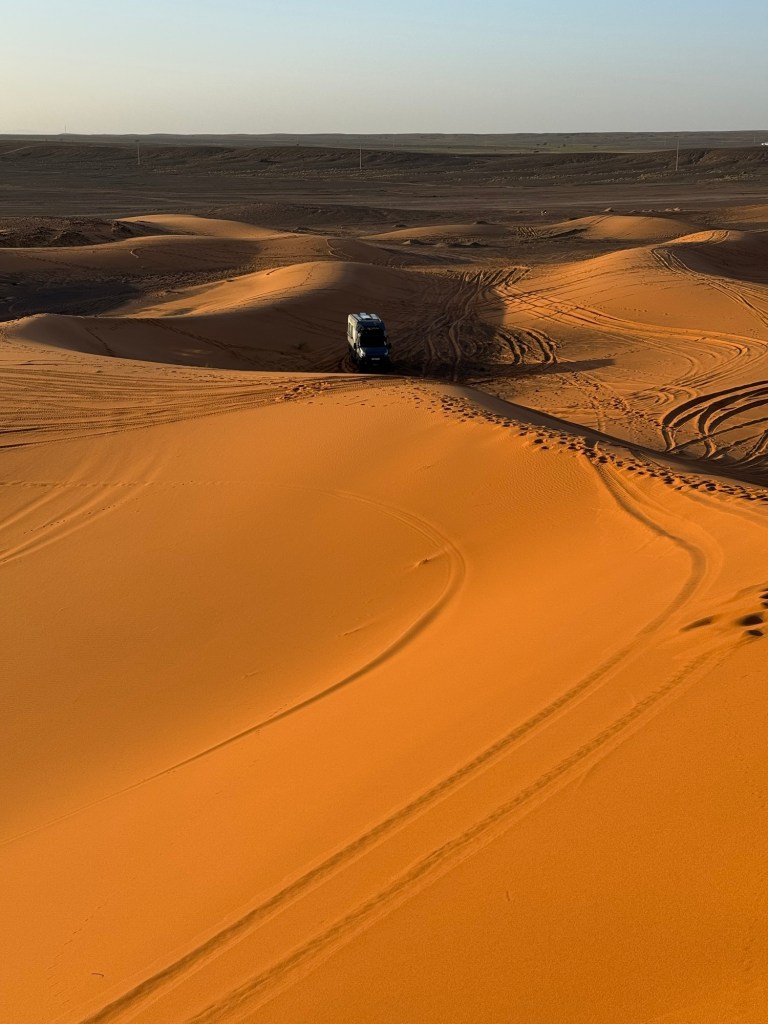We skirted the big dunes following a track on the Garmin created by someone else in a 4×4, but when the track turned sharply into the deep sand, I realised it would be foolish to follow. It was getting late, the sand was soft and deep and that makes a dicey prospect for a five and a half ton truck. We headed on to a flat space between the dunes, and then spotted somewhere else just a leeeetle further in. The truck slowed and it felt like we may have got bogged in but it was the perfect place to park for the night and it had been an irritating journey so we both kept our “bogged in” thoughts to ourselves. I turned off the engine and the desert silence filled the cab. We had driven from the UK to the Sahara, which felt like something.