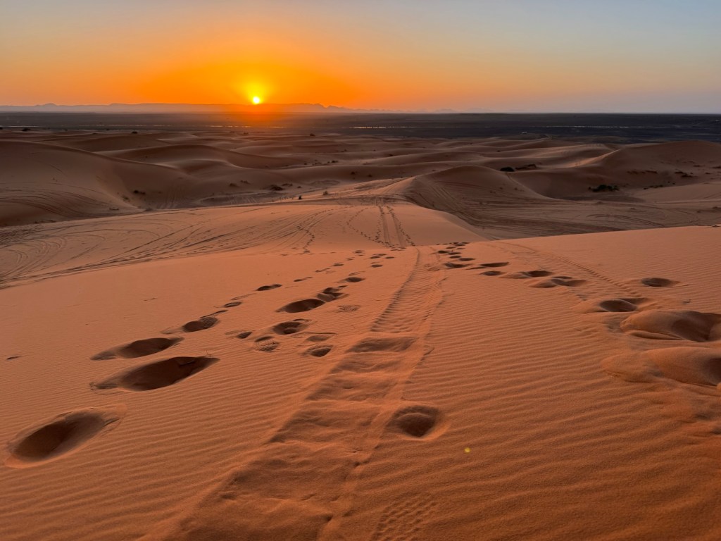 The next day, we filled our water tank and headed south. The drive was drier and flatter and outside Merzouga a thrilling line of buttery dunes appeared on the horizon.
