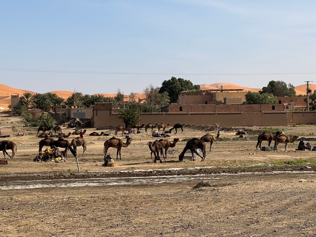 Then ho for the dunes. Except we couldn’t really find a way to get to them initially; our Garmin sending us up back-streets of carved-up concrete-hard mud, behind shops, through palm groves – or out of town the wrong way. A track into the dunes I was aiming for turned out, on closer inspection, to be a walking route. Another looked more likely 20 minutes north of town. So we headed back the way we’d come in, pulling off onto another mud road behind a hotel and then through a hole in a wall to the camel camp at the edge of the dunes.