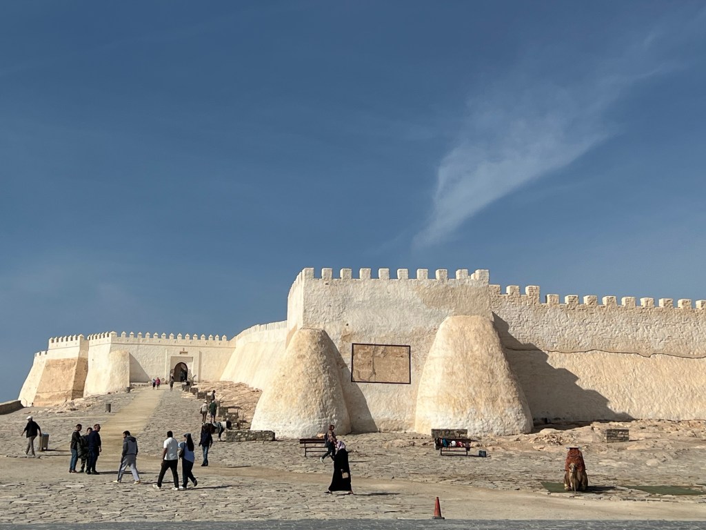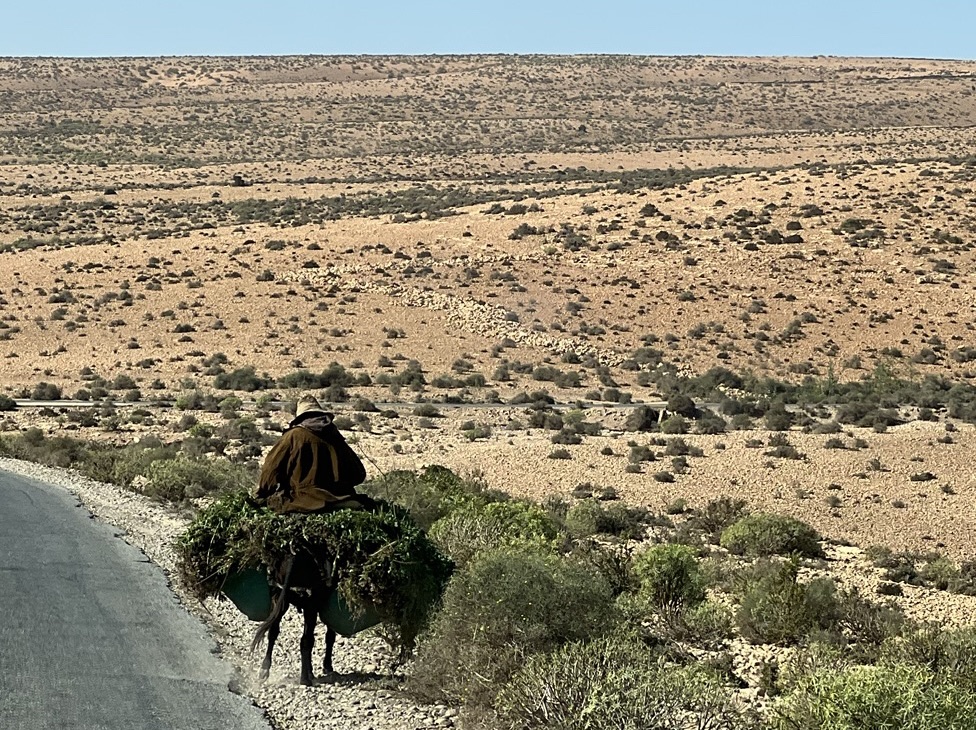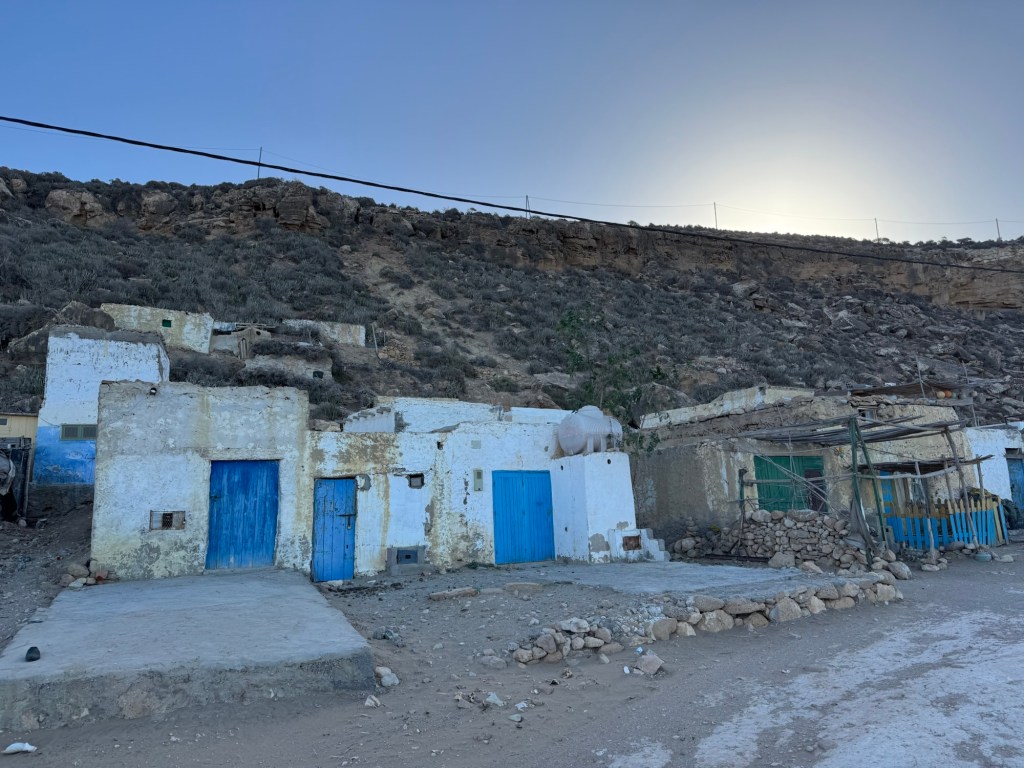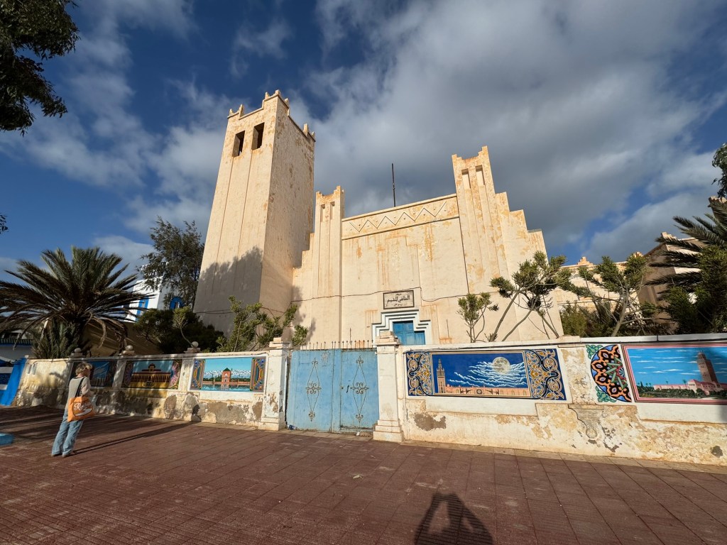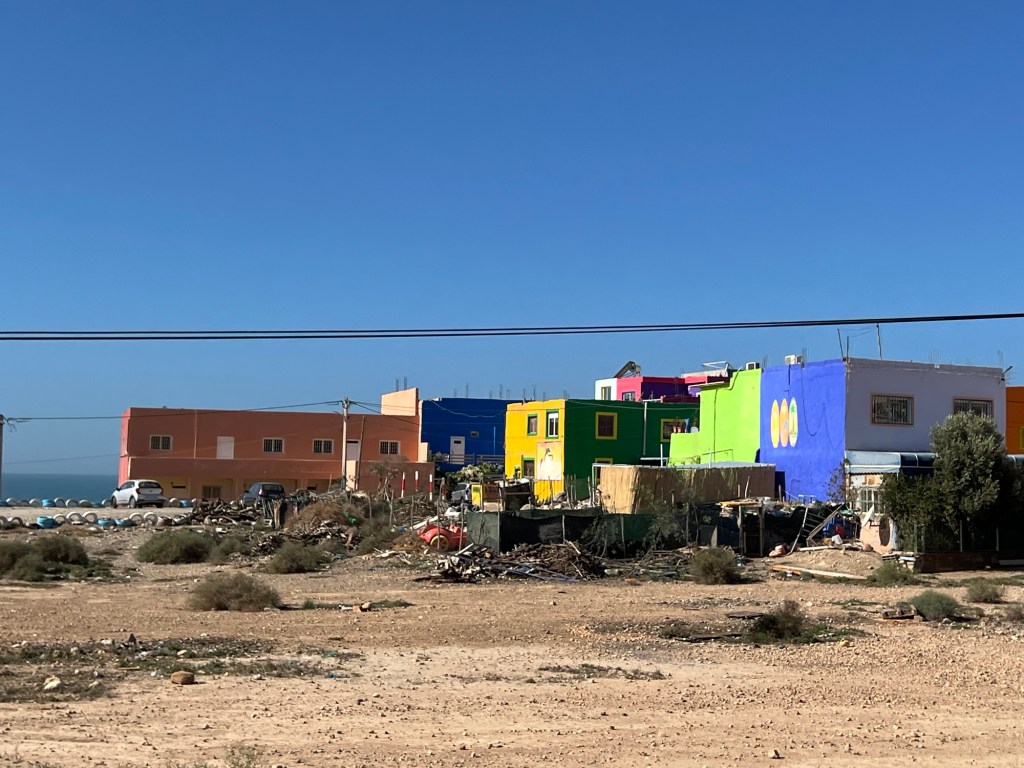 It felt like the last stop on our tour of the Atlantic Coast. Western Sahara was still some way further south but we were seeing more Sahrawi people (literally “inhabitants of the desert”) in their distictive pale blue and gold robes, and Touareg men in their brilliant blue turbans (the “cheich”) with the material permanently draped around their noses and mouths to keep any possible sandstorms out. The character of the landscape was changing too. Sandier, dryer, more stark. We were heading back into the desert.