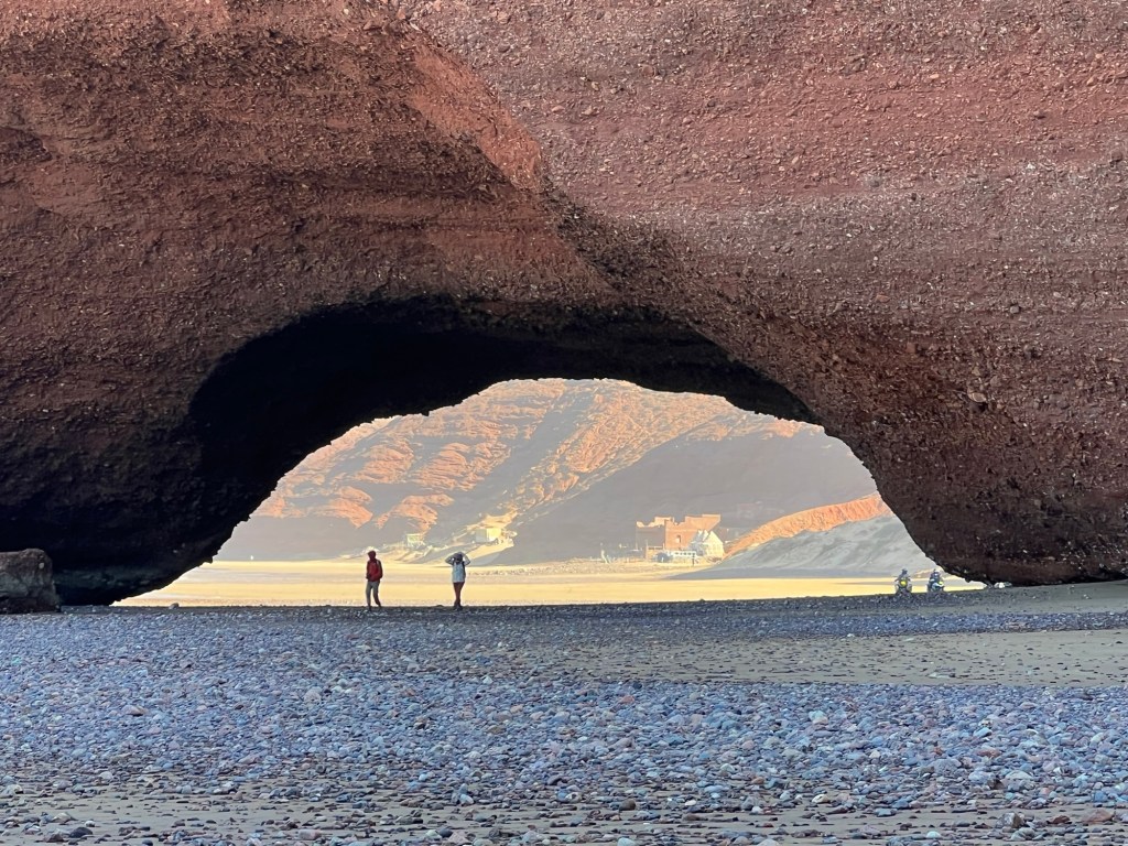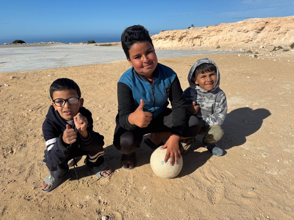 Back on the highway, on the cliffs near Imsouane we pulled into a layby for coffee from a roadside vendor. The guy had a coffee machine bolted into the back of a small van, and a couple of plastic chairs. You see these quite frequently in Morocco and we’ve discovered that they are invariably run by people who take great pride in their coffee; preparing it with frowning concentration, checking pressures and temperature, frothing the milk just so, and anxious that we like what they’ve made. It has always been good. We took our coffees onto a flat area behind the van to look at the view, followed, nonchalantly by two boys with a football who seemed to be with the coffee stall guy. The ball came our way and I kicked it back and then we were having a kickabout in the hot sunshine, which was their plan all along of course. They were such bright, polite lads. Where were we from? Which team did we support? Where were we going?