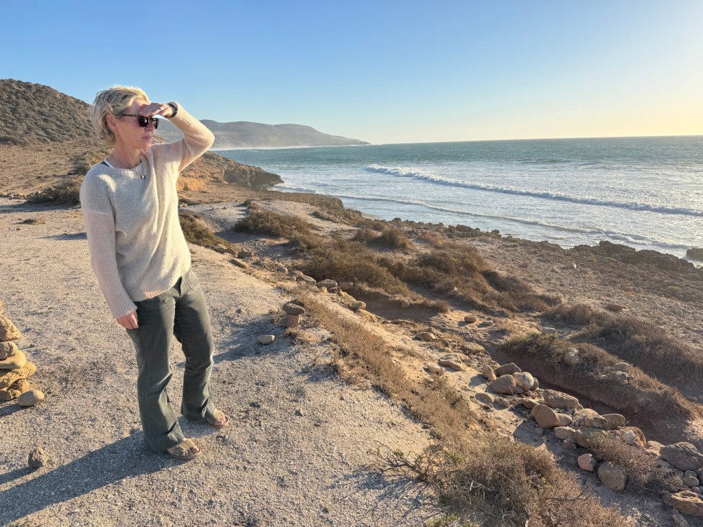 With the wind rising and the sun lowering we headed for the cafe across the track from us, surprising the owner who’d been listening to some music. He jumped up, beckoned us to seats facing the sea. “Thé de menthe?” He asked. Perfect. It came in a tall silver pot with a plate of home-made biscuits. He poured it from a height into the glasses and went back to his music. A hopeful dog came over and settled down to sleep with its head against my foot. Morocco is full of hopeful dogs.