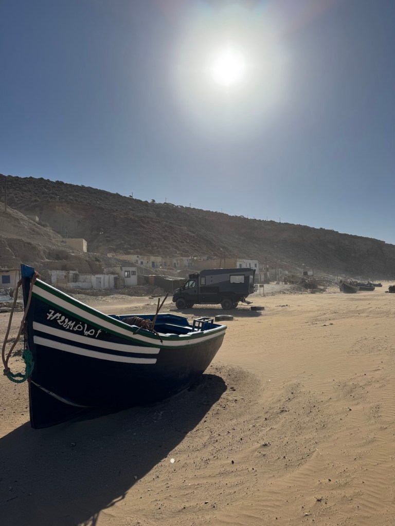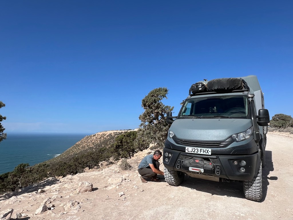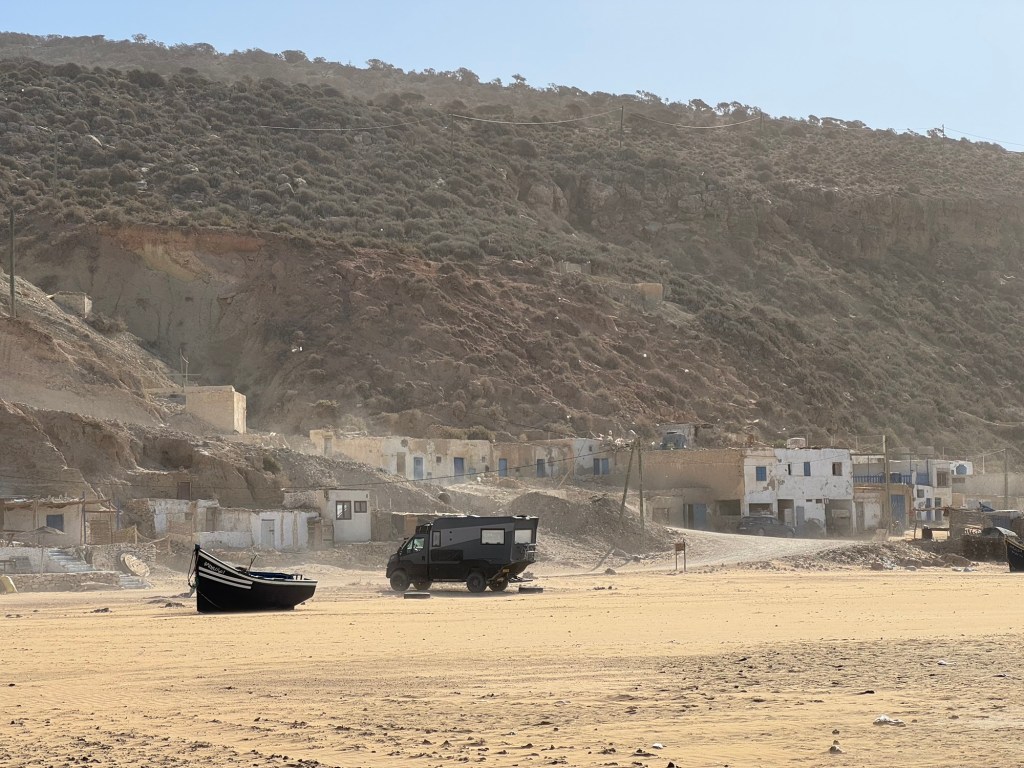 The road which hugs the coast south from Essaouira is rough enough to dispense with most tourists. It is a dusty, unpaved track which moves serpent-like over the cliff along the shoreline; twisting, rising and falling with a substantial drop to the wide blue ocean on one side and groves of olive and argon on the other, concealing isolated small farms. It makes for a lonely, windblown journey and the track was so tight that it was surprisingly hard to find a place to pull off to spend the night. In an effort to find one, we diverted on to an even narrower, bumpier track which became increasingly precarious but also gave us a view of a fishing village in a haze of sea spray way below us – Sidi Ahmed. We drove on until we could turn Arnie around without sliding into the sea and then we found the zigzag track down to the beach. The bottom section was the steepest and roughest; Arnie dug in and slipped only a little, watched by a couple in a white-box camper on the beach who were clearly questioning the wisdom of their driving choices. They gave us white-faced smiles and the woman in the passenger seat crossed herself. As we got to beach level, the driver floored the camper and got part way up the first section until the wheels span and he had to reverse back down. The second attempt was more successful; the rear end shimmying for grip and spitting stones until they finally got traction and bounced back up the cliff side.