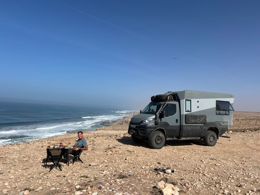It struck me that this was Morocco of old: unchanged for generations, low rise, hard to reach and literally off the beaten track. The developers had yet to move in, but when the road was sorted, they probably would. The beach was too good for them to ignore, with a constant crashing surf and wavelets reaching across the sand. We walked along it and watched the sun sink and the sky turn apricot. When we got back to Arnie, the cafe was closed, the owner had vanished. The tide was still coming in, pushing exploratory ripples up the beach towards us to the point that we wondered if we needed to move. But the tideline, marked by the ropey detritus of the fishing fleet seemed a safe distance away.